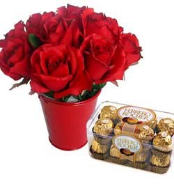 flower's and chocolate12 red roses vase with chocolate heart shape.