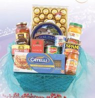 Basket beautyPalm Corned Beef 326g Ferrero Rochcher Chocolate 300g Catelli Lasagne 500g Royal Dansk Chocolate Chip Cookies 454g Libby’s Vienna Sausage 130g Nescafe Gold Coffee 100g Libby’s Corned Beef 340g Lyons Red Label Tea 40g Del Monte Fruit Cocktail 850g Smucker’s Sweet Orange Marmalade 340g Dole Sliced Peaches 665g Bertolli Italian Sausage Garli & Romano Pasta Sauce 680g Spam Luncheon Meat 340g