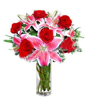 Angel Kiss9 premium red roses and 3 pink perfume lilies, small flowers and green leaf or decorated, arranged in a beautiful vase.