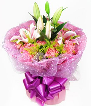 Feeling of Happiness19 pink carnations, 2 pink lilies with purple net inside and pink crepe paper outside.